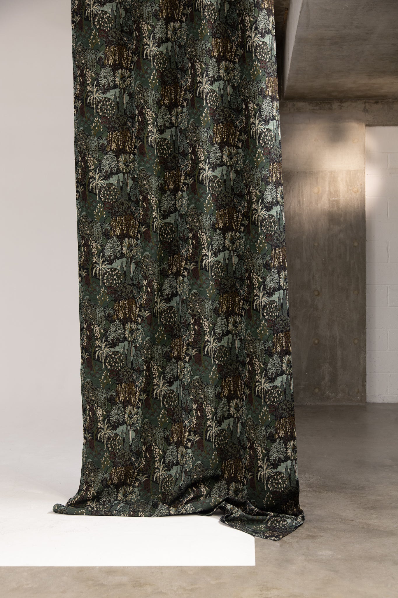 Tactile cotton blend patterned fabric with scenic pattern.